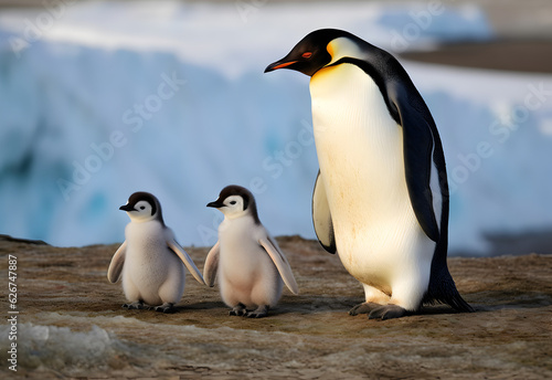 Dad or mom and baby penguins. Father love, bond and parenting concept.