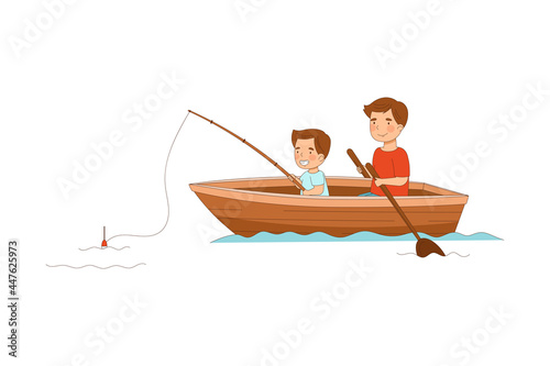Dad with His Son Sailing on Boat with Fishing Rod and Catching Fish Vector Illustration