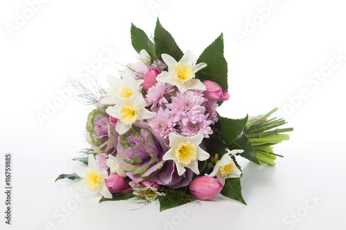 Daffodil, chrysanthemum, tulips and brassica flowers bouquet