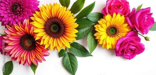 Dahlia, sunflower, and magenta rose bouquet on white, sunflower, decoration