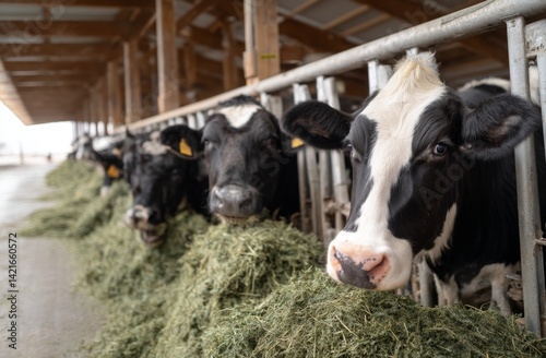 Dairy Cows Eating Hay in Modern Barn: Agricultural Farming Practices Showcase Healthy Livestock