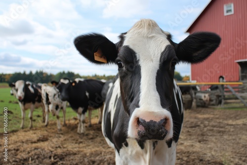 Dairy Farm Wisconsin. Holstein Cows Grazing on Meadow in Barnyard