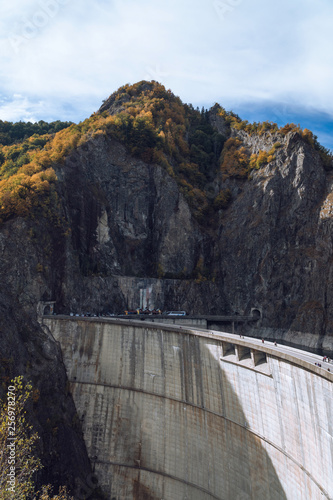 Dam lake Vidraru in Romania, autumn sunny day, vertical photo