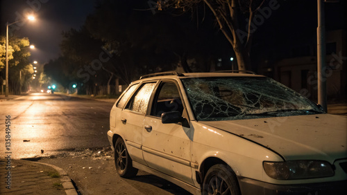 Damaged car with shattered windshield and scratched paint parked on a quiet street, depicting vehicle accident aftermath and insurance claim scenarios.