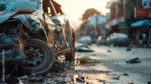 Damaged in heavy car accident vehicles after collision on city street crash site. Road safety and insurance concept.