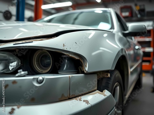 Damaged used car in a mechanic’s garage, perfect for repair or spare parts, professional stock photo