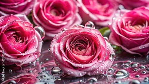 Damask rose flowers in full bloom, surrounded by a ring of small water droplets that create a sense of depth and dimensionality on their petals , close-up, flowers