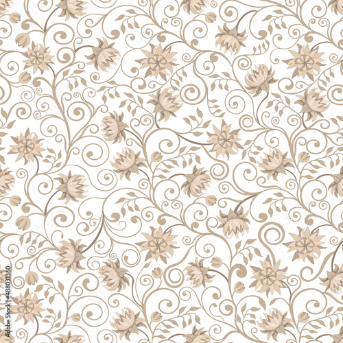 Damask style hand drawn swirl pattern, flowers, white background. Seamless pattern, vector.