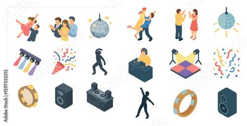 Dance and party isometric icons set – celebration, music, fun elements