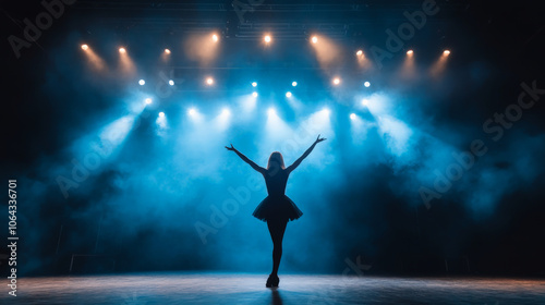 dancer in tutu poses dramatically on stage, illuminated by blue and warm lights, creating captivating atmosphere