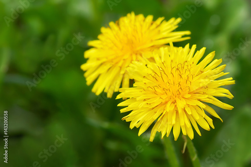 Dandelion flowers in a field, selective focus with green blurry background. Copy space