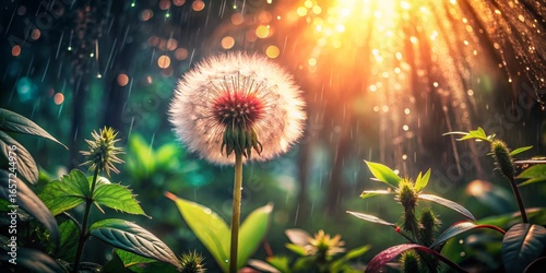 Dandelion Seed Head in Rain with Sunlight