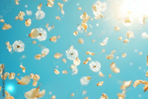 Dandelion seeds floating in the breeze on a bright blue background illustration --ar 3:2 - Image #4 @fme39856