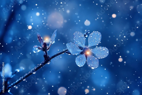 Dandelion with dew drops on a blue background. Close-up. Desktop wallpapers.