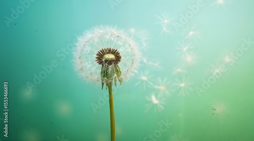 Dandelion with seeds blowing away in the wind across a clear blue sky with copy space