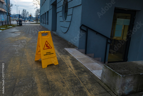 Danger, slippery stairs, ice on the sidewalk, attention: wet and slippery entrance to the building