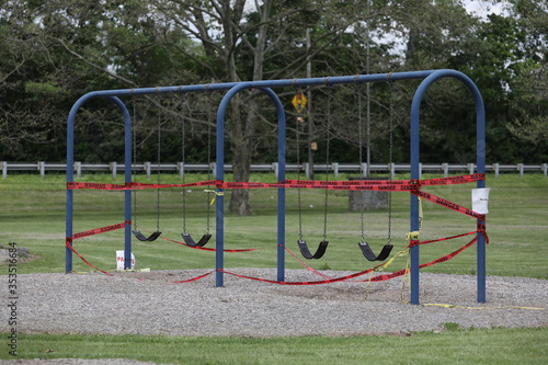 Danger tape is wrapped around playground equipment, indicating the park is closed due to Covid-19 concerns.
