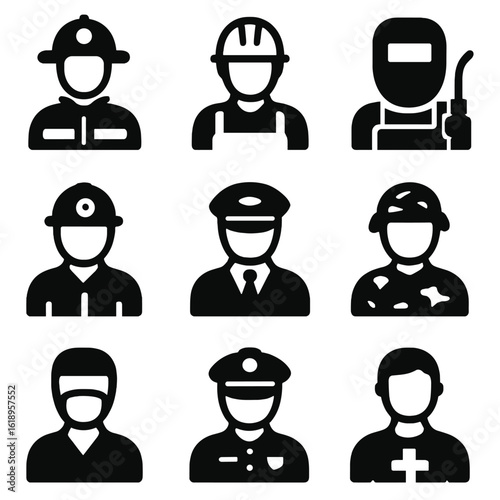 Dangerous Occupations Icons. Solid, filled icon set of dangerous occupations: firefighter, construction worker, welder, miner,