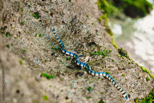 Dangerous Sea snake Krait on stone. Venomous reptile outdoor