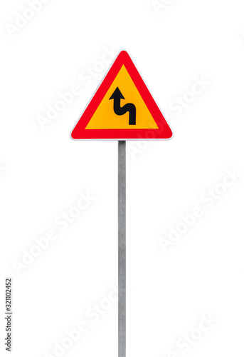 Dangerous turns, red triangle warning road sign