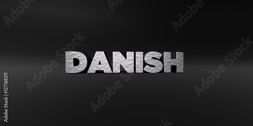 DANISH - hammered metal finish text on black studio - 3D rendered royalty free stock photo. This image can be used for an online website banner ad or a print postcard.