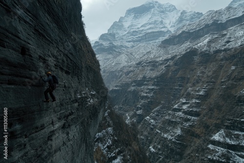 Daring climber navigates rocky ledge in majestic snowy mountain landscape