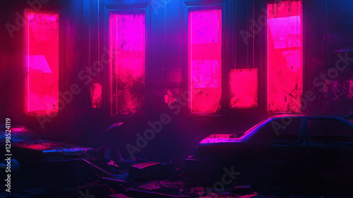 Dark abandoned industrial scene with neon lights and vintage cars