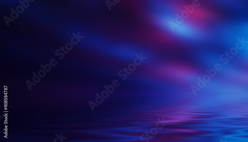 Dark abstract background. Neon multicolored light reflects on the water. Beach party, light show. Blurry lights glisten on the surface. 3d illustration