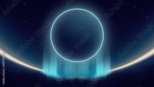 Dark abstract futuristic landscape, blue neon, reflection in the water.