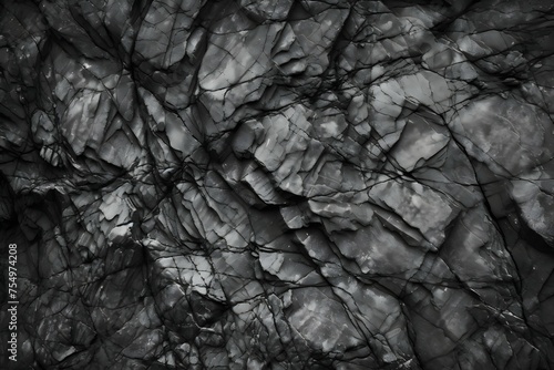 Dark Aged Shabby Cliff Face And Divided By Huge Cracks And Layers. Coarse, Rough Gray Stone Or Rock Texture Of Mountains, Background And Copy Space For Text On Theme Geology And Mountaineering.