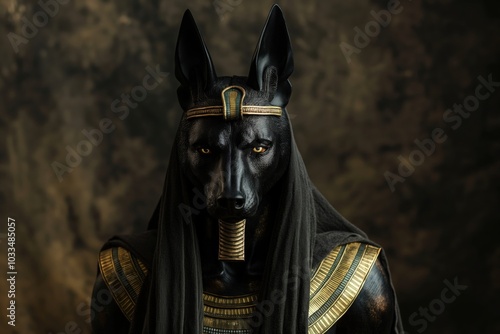 Dark and dramatic depiction of anubis, the egyptian god of death, wearing gold and black