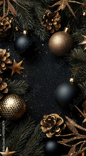 Dark and Gold Christmas Background with Decorations on Fir Tree