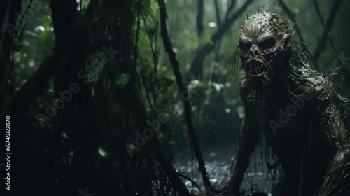 Dark and Scary Demon Creature in the Rainy Jungle of Horror Generative AI