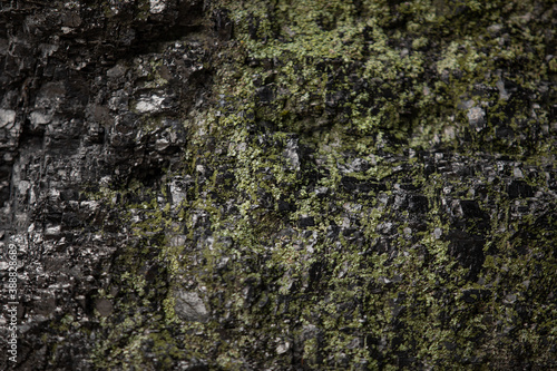 Dark and wet concrete wall with green moss background,