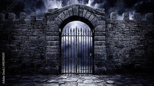 Dark Arched Doorway with a Locked Gate. The Scene Features an Imposing, Old-Fashioned Archway Framing a Heavy, Secure Gate,