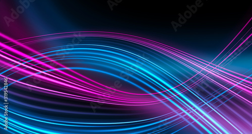 Dark background, blue and pink neon lines. Symmetric reflection of geometric shapes.