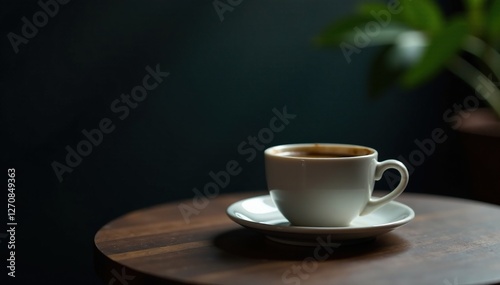 Dark background with a single cup of coffee on a small table, still life, coffee