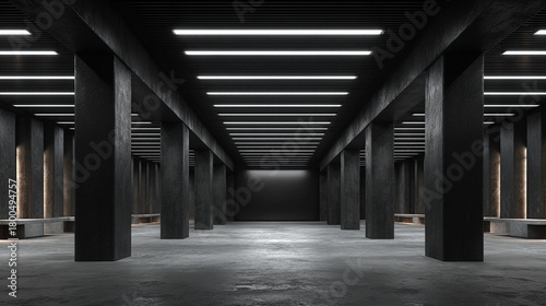 Dark black empty architectural interior studio with minimalistic walls and spacious backdrop ideal for product display modern design clean lines 3D rendering highlighting simplicity and elegance