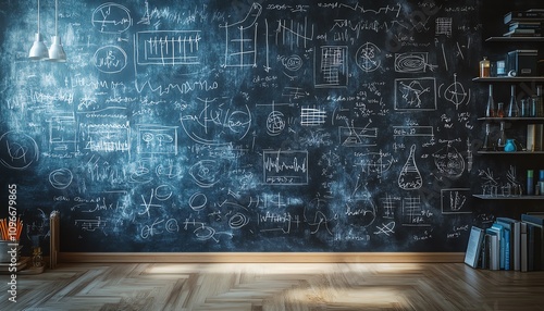 Dark blackboard with a variety of handdrawn scientific and educational sketches, including math formulas and biology diagrams, generative AI concept