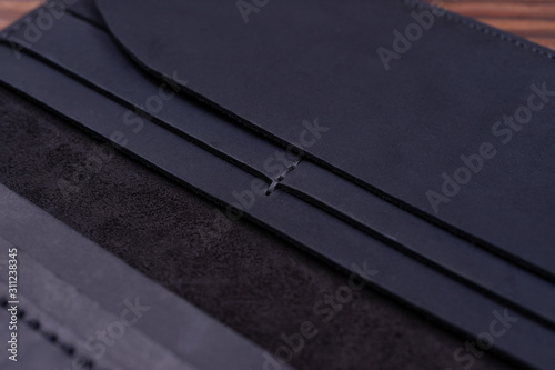 Dark blue handmade leather wallet details closeup. Pockets for cards, hue picture.