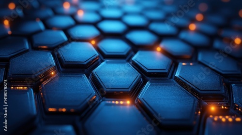 Dark Blue Hexagonal 3D Abstract Geometric Background with Metallic and Matte Textures Sci-Fi Minimalist Architecture Style
