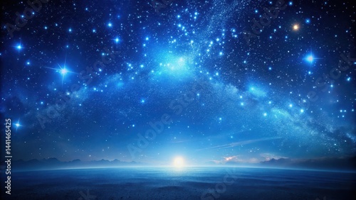 Dark blue night sky with scattered starlight and a subtle glow effect from blue light overlay on the horizon, creating an otherworldly atmosphere, fantasy, glow effect