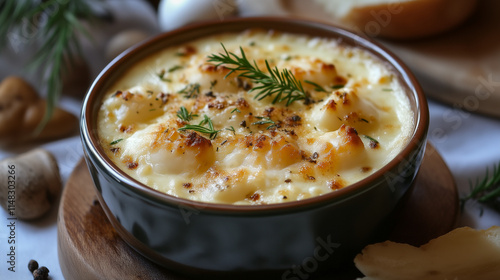 Dark bowl full of a soup with cheese.