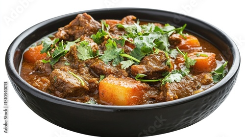 Dark bowl holds a hearty stew of browned meat and potatoes, topped with fresh cilantro