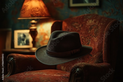 Dark brown fedora hat floats above a vintage armchair in a dimly lit room.