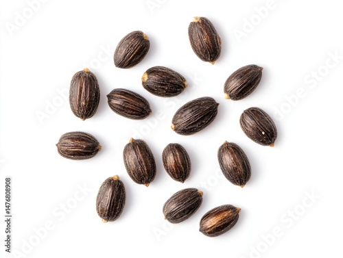 Dark brown seeds scattered on a white background. Small, oval-shaped seeds with a slightly ribbed texture. Close-up view