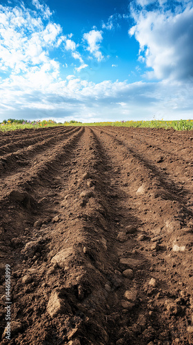 Dark brown soil texture, freshly plowed field, rows visible, blue sky with clouds background, suggesting new beginnings, agriculture, and growth