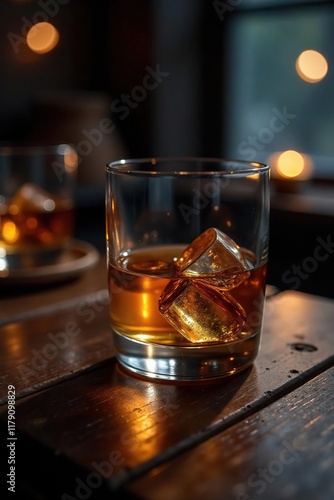 Dark brown surface with a glass of whisky spirit on it, night, ambiance, wood