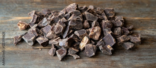 Dark chocolate chunks on rustic wooden surface with copy space for text.