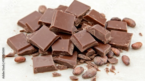 Dark Chocolate Pieces with Cocoa Beans on Light Background